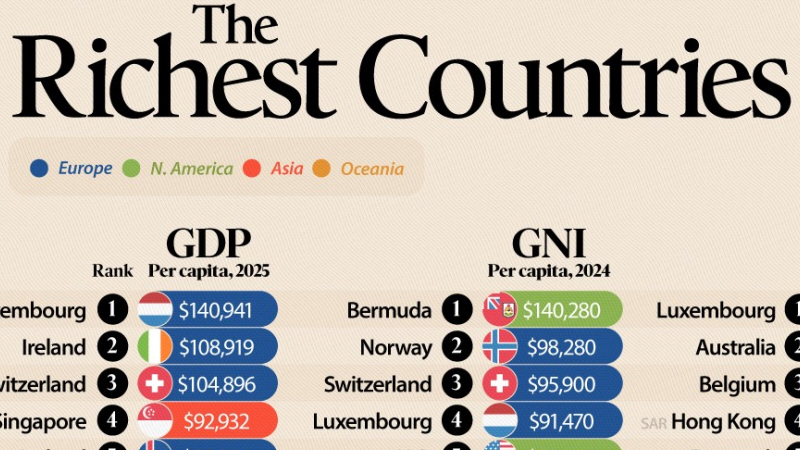 Ny undersøgelse fra Visual Capitalist præsenterer en rangliste af verdens rigeste lande baseret på tre forskellige målinger: