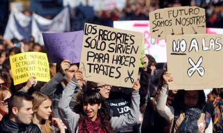 I går demonstrerede titusinder af universitetsstuderende over de stigende afgifter og sociale nedskæringer i storbyer som Zaragoza, Oviedo, Santiago de Compostela, Granada og Salamanca.