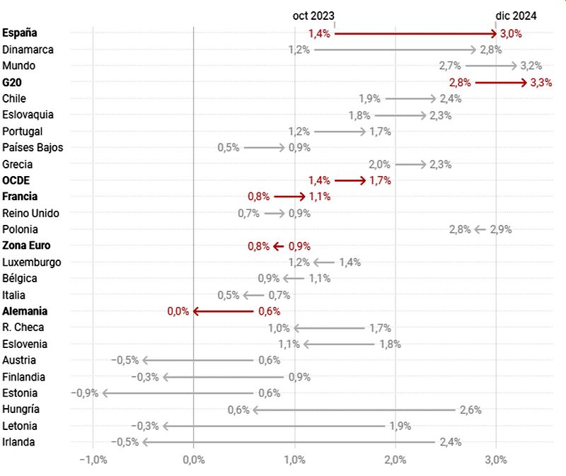 I løbet af året har de BNP-data, som INE har offentliggjort, systematisk overgået alle prognoser. Husholdningernes forbrug, ankomsten af udenlandske turister i ny rekord, og de offentlige udgifter har drevet en økonomi, der har modstået stramningen af renteniveauet bedre end forventet. De store vindere i 2024 har været tjenesteydelser og især aktiviteter, der er tæt knyttet til turisme, som handel, transport samt hoteller og restauranter.