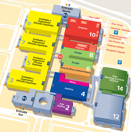 FITUR dækker et areal 75.000 m2 fordelt på 10 pavilloner. Den gule farve er offentlige institutioner, turistforeninger, provinser, kommuner, nationale turistråd, etc. Den røde farve er private virksomheder som rejseselskaber, hotelkæder, forlystelsesparker, golfbaner, etc. De øvrige farver er andre lande.