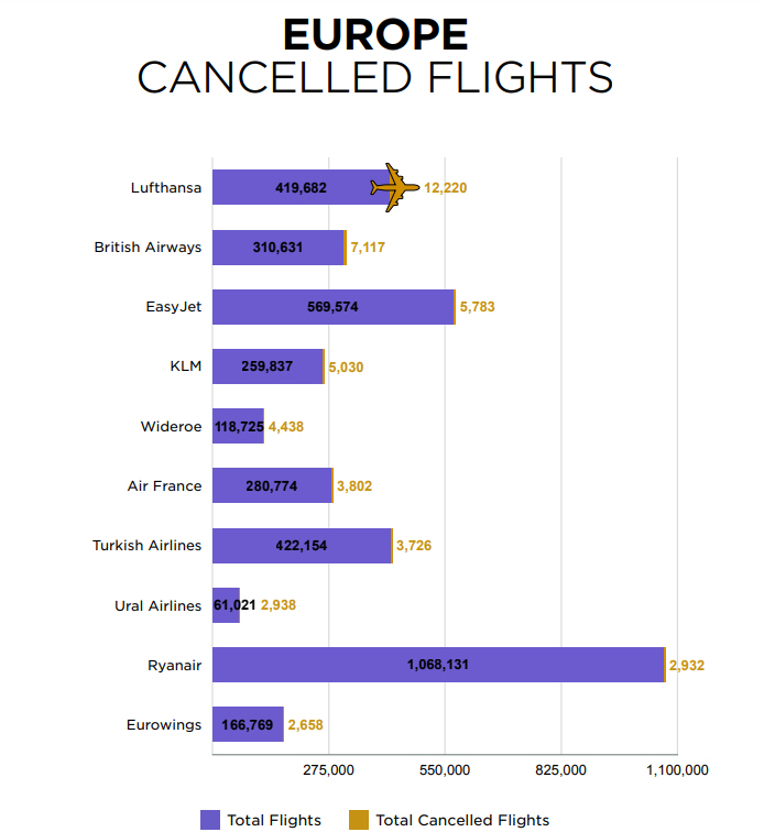 I rapporten kan man også se, hvor mange fly der blev aflyst sidste år blandt Europas største, og her er det tydeligt, at det gik helt galt for Lufthansa: