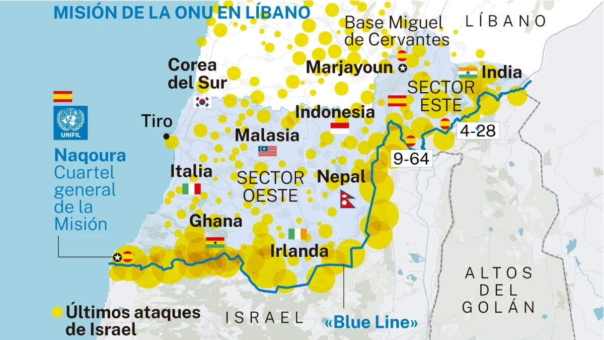De 670 spanske blå hjelme i FN-tropperne patruljerer ikke længere og tilbringer 14 timer i beskyttelsesrum, mens bomberne falder i nærheden af deres stillinger.