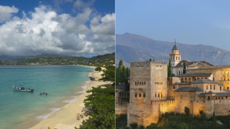 Mand og kone undrede sig over, hvorfor de fløj mod vest fra England, når rejsen gik mod det spanske. "Spanien? Vi er på vej til Caribien," lød stewardens svar. Granada og Grenada staves og udtales næsten ens, men de ligger ikke ligefrem tæt på hinanden.