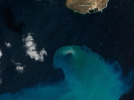 Billedet blev taget den 10. februar 2012 og viser den store grønne plet i havet fra vulkanen lige syd for den lille fiskelandsby La Restinga. Vulkanudbruddet kreerede undersøiske bjerge, og selve krateret ligger i dag 82 meter under havets overflade.