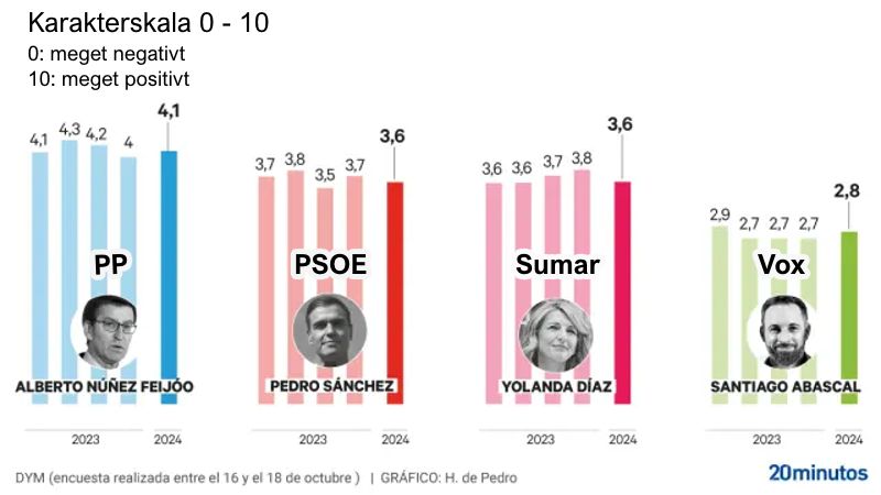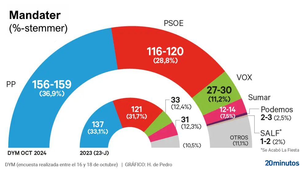 I DYMs undersøgelse, der er foretaget for 20minutes, går PP næsten fire procentpoint frem i forhold til valget den 23. juni. 2023, mens de to største partier i regeringskoalitionen, PSOE og Sumar, har mistet stemmer siden da.
