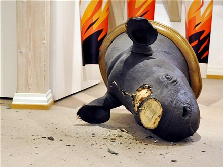 Politiet-kilder fortæller, at mens to personer distraherede personalet på museet, klatrede to andre op på en montre, løftede et næsehorns-hoved ned fra en væg og hamrede hornene af.