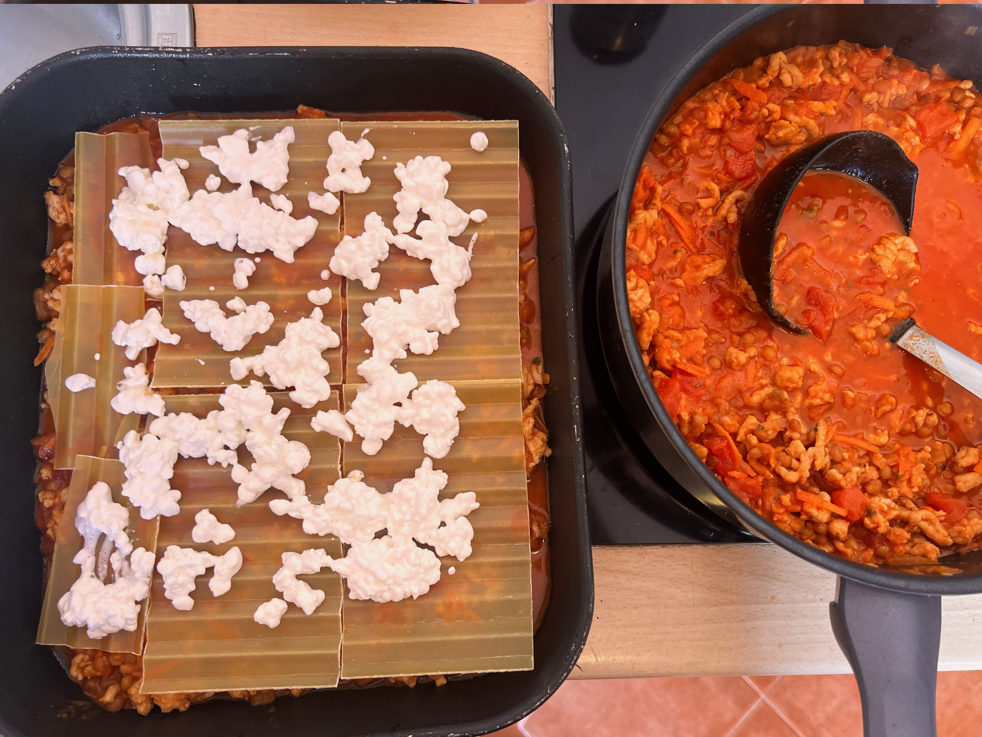 Så endnu et lag kødsovs, og så et lag pastaplader og resten af hytteosten.