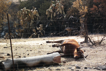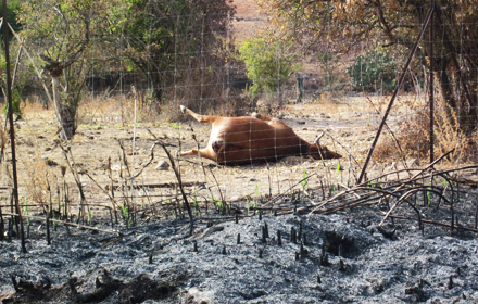 En uge efter branden. En død ko - oppustet som en ballon i 30 graders varme