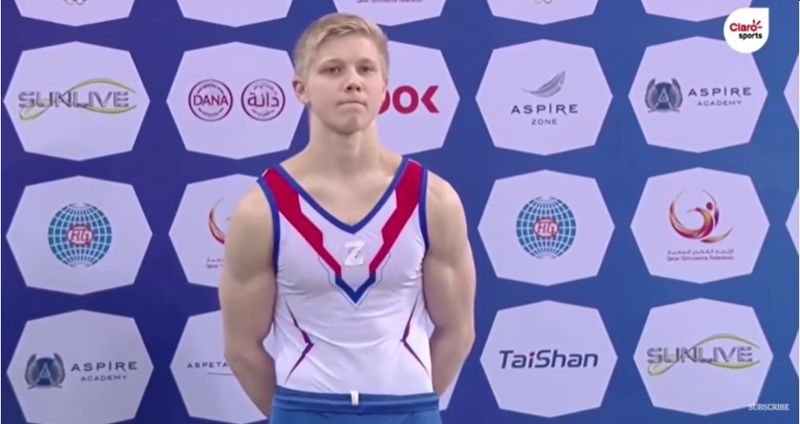 Putin har allerede blandet Z-tegner ind i sporten. Her, hvor den russiske gymnast Ivan Kuliak bærer Z-tegnet på sin trøje under et stævne i Doha i marts, hvor han stod ved siden af ukraineren Illia Kovtun, der vandt guld.