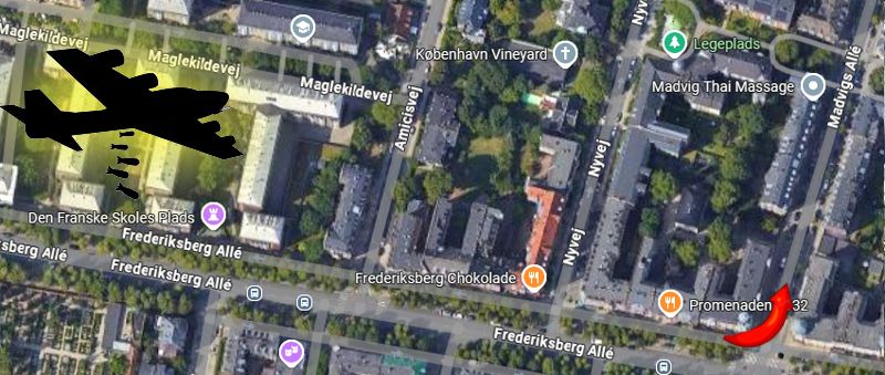 Onsdag den 21. marts 1945 klokken 11:16 var min mor netop drejet til venstre om hjørnet ad Madvigs Allé med min to måneder gamle storesøster i barnevognen. Fire til fem minutter forinden var hun netop gået forbi Den Franske Skole på Frederiksberg Allé.