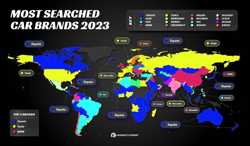 Internationalt set har Toyota været det førende bilmærke i de 155 undersøgte lande i fire år i træk, selvom Teslas comeback har betydet, at den japanske bilproducents føring er faldet fra 69 lande i 2022 til 64 i 2023.