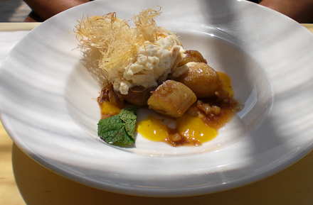Selvom maven ikke havde brug for mere de næste par timer, var lysten til at give sig i kast med en dessert alligevel overvældende. Indtil nu havde alt været lige i øjet, og ofte har vi tendens til at springe desserten over i frygt for at blive skuffet og i erkendelsen af, at vi alligevel ikke er mere sultne. Heldigvis valgte vi rigtigt. En hjemmelavet chokoladekage med tilsvarende figen- og mangosorbet blev lækkert serveret og sat overfor flamberet banan.