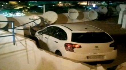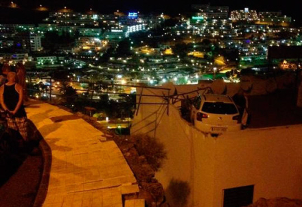 Dramaet foregik i Puerto Rico på Gran Canaria mandag aften, hvor bilen med tyskeren ved rattet fløj direkte over på taget af en bygning.
