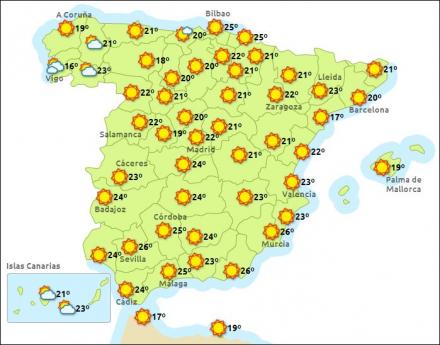 Hele landet får i dag letskyet vejr med undtagelse af Galicien og Cantabrien, hvor det bliver skyet. I resten af landet kommer der en del sol, men det bliver en smule køligere end her i weekenden, hvor termometret flere steder nåede et godt stykke op over 25.