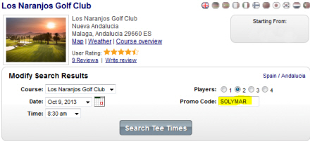 Som læser af Spanien i Dag, sikres du de til enhver laveste priser på green fee. Når du klikker i linket for Book Online og kommer til siden, hvor du kan reservere dato og tee time, skriver du SOLYMAR i Promo Code. Så vil du automatisk få den lavest mulige pris.