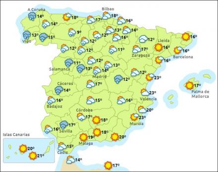 Madrid får i dag overskyet vejr med regn og mellem ti – 15 grader, Barcelona får fint solskinsvejr og ti – 17 grader, Valencia mest sol og 14 – 23 grader, og Málaga får også sol og 14 – 21 grader.