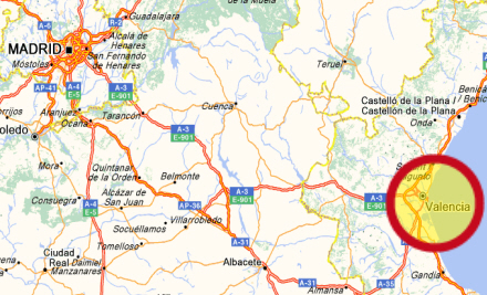 Afstande til Valencia:Fra Madrid: 355 km. 3:31 (1:30-1:50 med lyntoget AVE) Fra Málaga: 625 km. 6:21 og fra Alicante: 179 km. 1:57