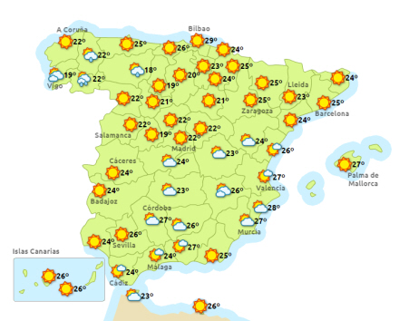 Generelt bliver der solrigt i hele landet det næste døgns tid. Det er faktisk kun i det Galicien, helt oppe i det nordvestlige hjørne af Spanien, hvor der kan falde enkelte regndråber.