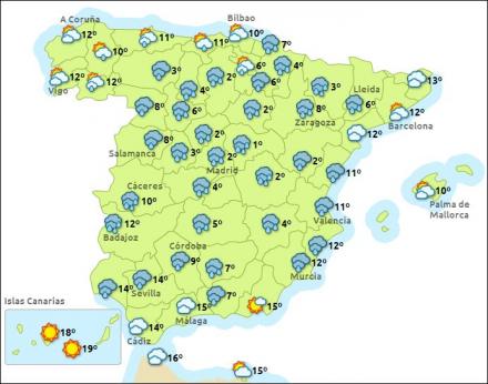 Madrid har i dag overskyet med slud og sne og mellem nul – fem grader, Barcelona tiltagende skydække og syv – 13 grader, Valencia har tiltagende skydække og mellem otte – 13 grader, og Málaga har ligeledes tiltagende skydække med mellem otte - 17 grader.