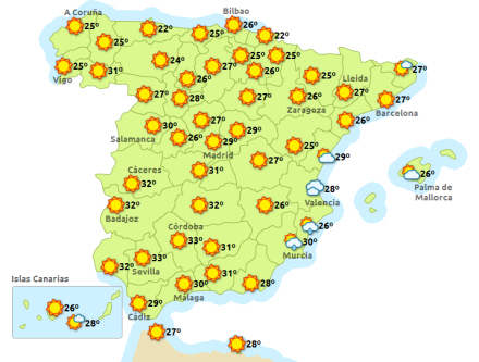 Costa del Sol får i de næste dage mere skyet vejr, men mest tørt. Der kan dog komme en smule regn i nat, men ellers bliver det letskyet med ret svag vind fra sydøstlige retning. Temperaturer under det normale for denne tid - nemlig kun mellem 24 og 29 grader. Mandag fortsat letskyet, tørt og en smule køligere. Tirsdag og onsdag bliver det til gengæld igen varmt og solrigt med op til 34 grader, mens nattemperaturen falder til 18 grader. Resten af ugen solrigt og tørt og mellem 22 og 35 grader, varmest søndag.