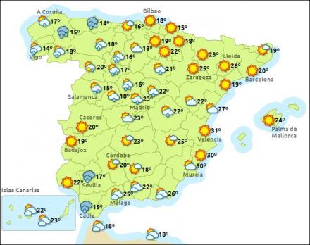 Vejr i Spanien, lørdag kl. 15:00