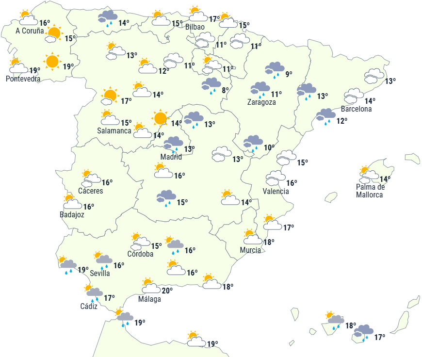 Dagstemperaturerne stiger på den nordligste del af halvøen. De falder derimod i den sydvestlige del af fastlandet, Galicien, på De Baleariske Øer og De Kanariske Øer samt langs det nordlige Middelhavområde – særligt markant i sidstnævnte.