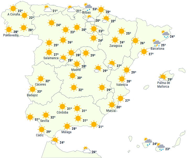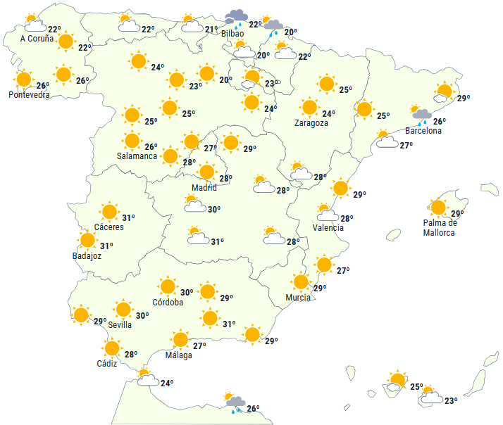 - Dagstemperaturer på 36 til 38 grader i det sydvestlige indre af Den Iberiske Halvø og 34 til 36 grader i det sydvestlige Galicien.