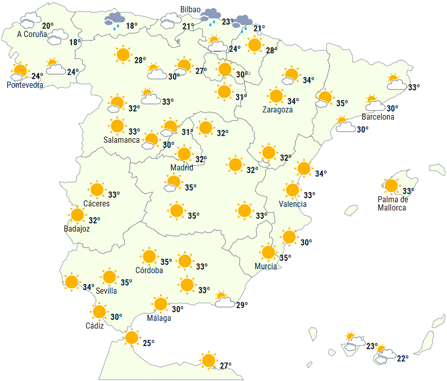 - Dagstemperaturerne forventes at være meget høje i store dele af det nordlige højland, i nordøst, på den sydlige halvdel af halvøen og i det indre Galicien, hvor der forventes 34 til 36 grader - lokalt endnu højere. I Guadalquivir-dalen, Extremadura og Ebro-dalen kan temperaturen overstige 40 grader. På De Kanariske Øer forventes 32 til 34 grader i bjergområderne og det indre af øen, men lokalt endnu varmere på Gran Canaria.