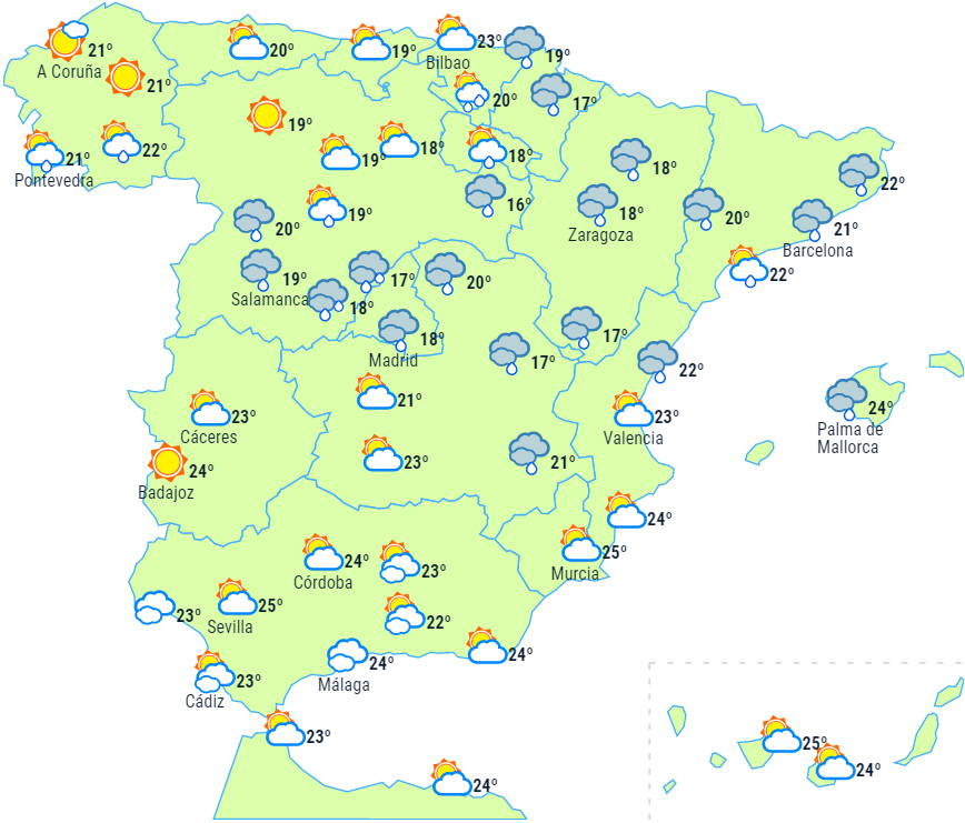 Ustabiliteten forventes fortsat at påvirke det indre af halvøen og De Baleariske Øer med en overvejende skyet himmel og gråvejr. Der vil være byger og lokalt kraftigt tordenvejr med hagl til en stor del af den nordlige, centrale og østlige del af halvøen såvel som De Baleariske Øer.