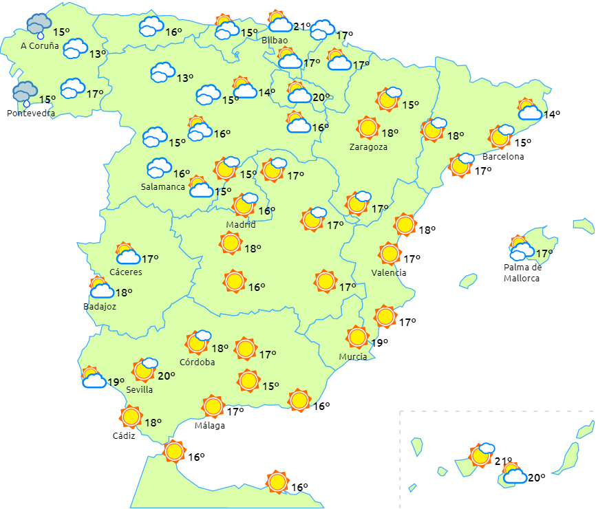 En ikke særlig aktiv Atlanterhavsfront vil trække ind over den nordvestlige del af halvøen og give skyet eller overskyet vejr og nedbør i Galicien og det vestlige Cantabrien. Lokalt kraftige byger er ikke udelukket i områderne nordvest for Galicien.
