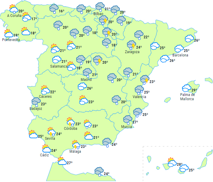 På resten af halvøen og De Baleariske Øer forventes letskyet himmel med højtliggende skyer, men om eftermiddagen tiltagende skydække på den nordøstlige halvdel af halvøen, hvilket giver spredte byger og tordenvejr. Mest sandsynlige og kraftige i Navarra, det nordlige Aragón og de omkringliggende områder, hvor der forventes kraftige byger og tordenvejr med hagl, og sidst på dagen også på den sydlige del af halvøen, Ebro-dalen samt i de centrale bjerge.