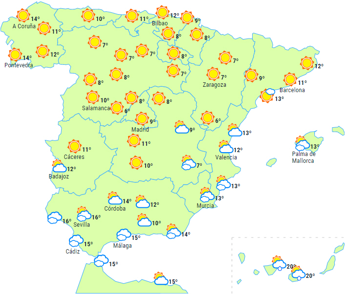Dagstemperaturerne vil stige i Pyrenæerne og falde på den sydvestlige halvdel af halvøen. Nattemperaturerne vil falde på den østlige tredjedel af halvøen og ellers kun få ændringer i resten. Der vil forekomme frost i den indre del af den nordlige halvdel og den sydøstlige del af halvøen. Lokalt kraftig frost i Pyrenæerne og i dele af De Iberiske Randbjerge.