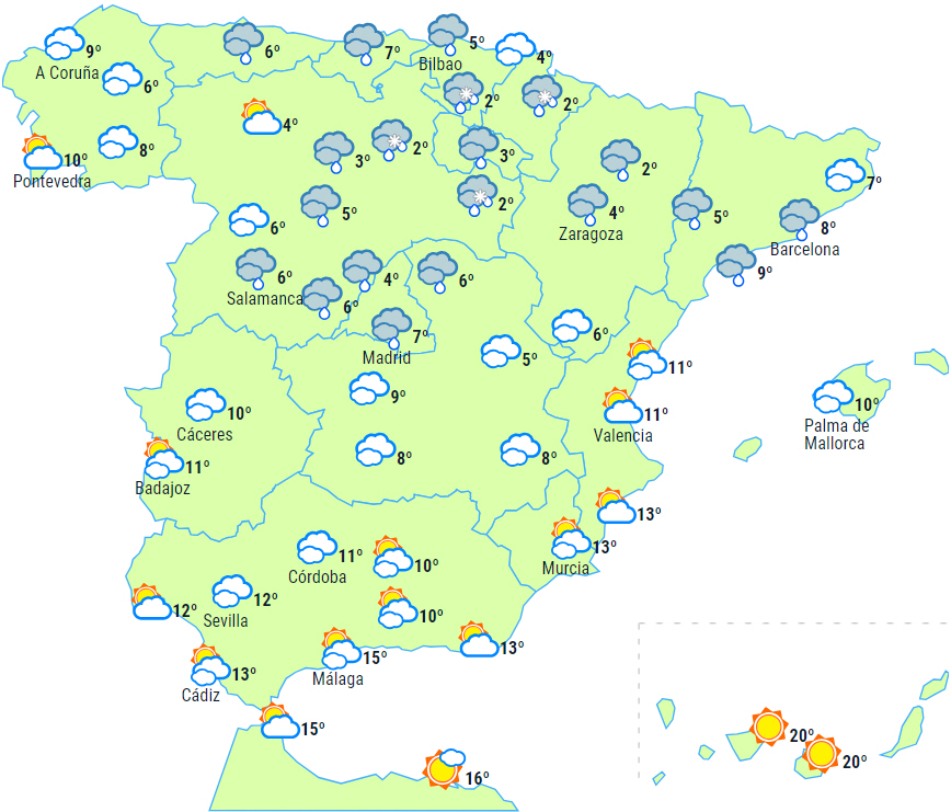 Overvejende skyet eller overskyet himmel over halvøen og De Baleariske Øer med nedbør til de fleste. Det forventes at holde mere eller mindre tørt eller i hvert fald være i småtingsafdelingen, hvis der kommer regn, på den sydvestlige del af halvøen og ved Alboran-kysten. Mest regn til den nordøstlige tredjedel.