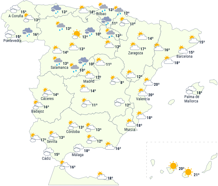 Passagen af en ny Atlanterhavsfront forventes at give ustabilt vejr til den nordvestlige del af halvøen med rigeligt med skydække og nedbør til Galicien og områderne langs Det Cantabriske Hav, men det kan også nå andre dele af den nordvestlige del og Pyrenæerne.
