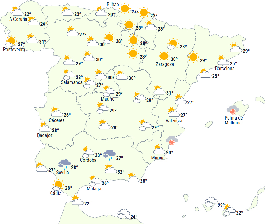 Der vil være letskyet eller højtliggende skyer fra de tidlige morgentimer over den sydlige halvdel, som har tendens til at brede sig mod nord. Fra middagstid dannes flere skyer, og med dem kommer der torden til store dele af den nordlige halvdel af Den Iberiske Halvø, det sydlige højland og bjergkæder i sydøst.