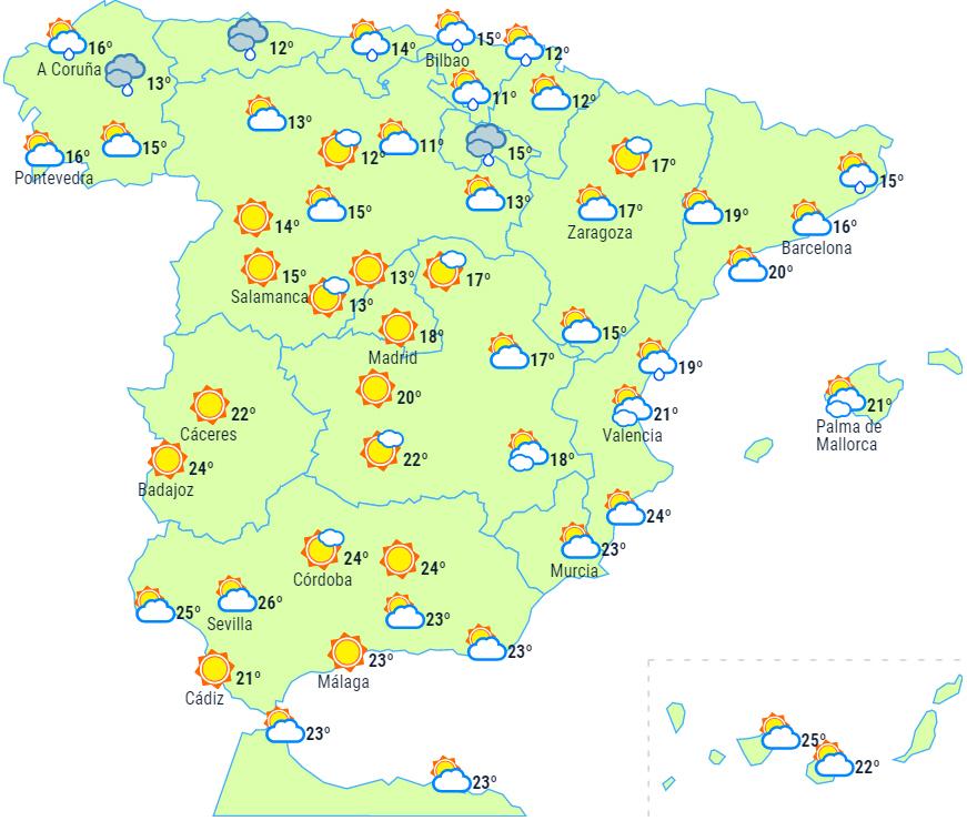 Temperaturerne stiger lidt på De Kanariske Øer, men i resten af landet er der tendens til, at de falder lidt - især dagstemperaturerne på Mallorca, i Aragón og i dele af Valencia og Andalusien. Der vil endda forekomme svag frost i Pyrenæerne! De højeste temperaturer ligger dog fortsat over 30 grader i Guadalquivir-dalen, i det indre af Huelva og på den sydlige del af Gran Canaria.