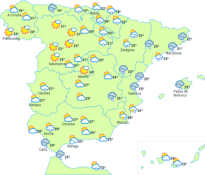 Der vil i løbet af eftermiddagen komme spredte byger til især bjergområderne, som af og til bliver ledsaget af tordenbyger, der lokalt kan være kraftige i det østlige Andalusien, Murcia, Valencia, det østlige Castilla-La Mancha og de sydlige af De Iberiske Randbjerge.