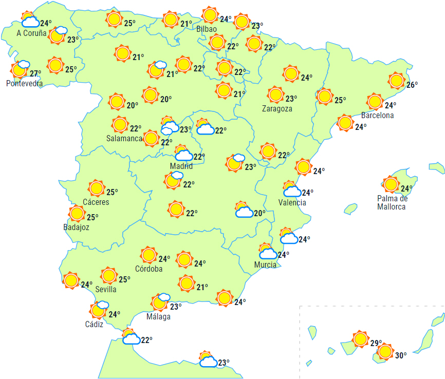 Vejret vil fortsat være stabilt over det meste af halvøen og De Baleariske Øer med letskyet til klar himmel. Kun ved Galiciens kyster og ved Det Cantabriske Hav, i Middelhavsområdet og i de indre dele af den sydøstlige del af halvøen forventes der nogle lavthængende morgenskyer, og der er mulighed for lokal morgentåge.