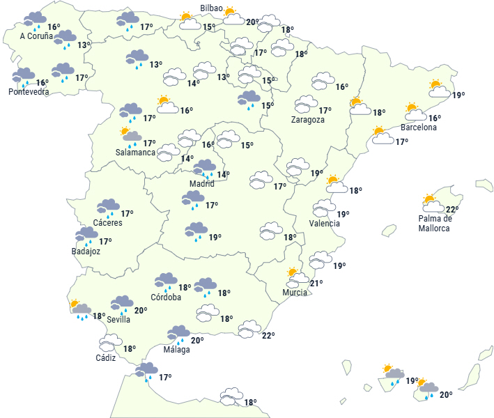 På De Baleariske Øer forventes kun højtliggende skyer, mens De Kanariske Øer vil opleve spredte, svage til moderate byger – dog sjældnere på de østlige øer og i mindre grad end i de foregående dage.