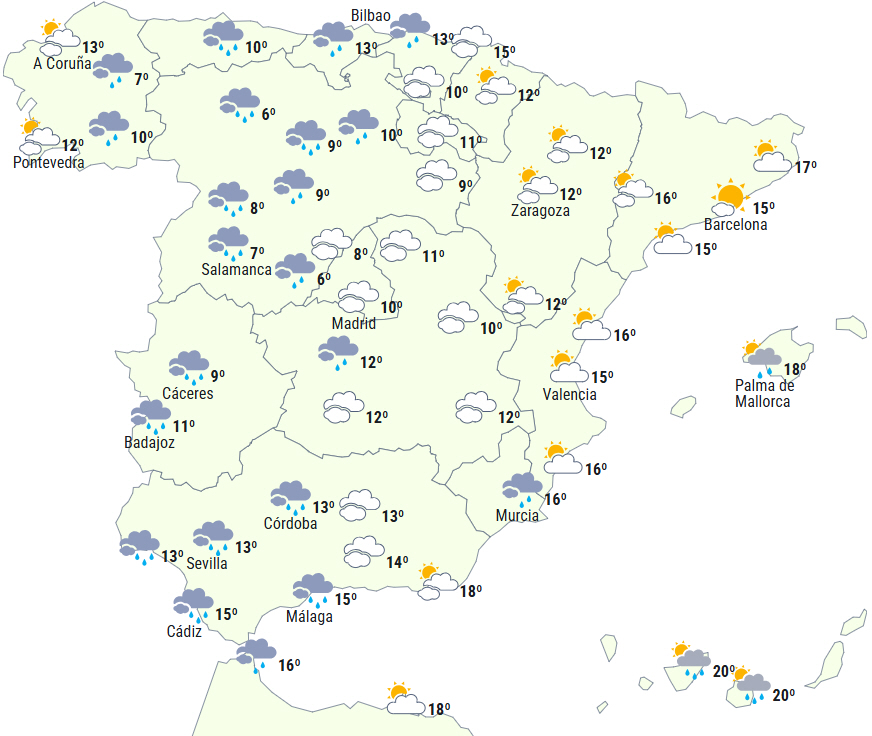 Skydækket vil dog blive fastholdt i nordvest på grund af ankomsten af en atlantisk front, som vil ende med at dække himlen over store dele af den vestlige halvdel af halvøen. Den vil bringe nedbør til den nordvestlige tredjedel og den vestlige del af Sistema Central i de sene timer, og det kan lokalt blive kraftig nedbør i dele af Galicien.