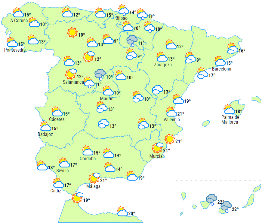 Dagstemperaturerne vil stige en smule i den nordlige halvdel af Middelhavsområdet og falde i Galicien, ved nordvestkysten og bjergene på halvøen. Nattemperaturerne vil falde i Galicien, mens der kun vil være få ændringer i resten af landet. Svag frost i de centrale og nordlige bjerge på halvøen - stedvis kraftigere frost i Pyrenæerne.