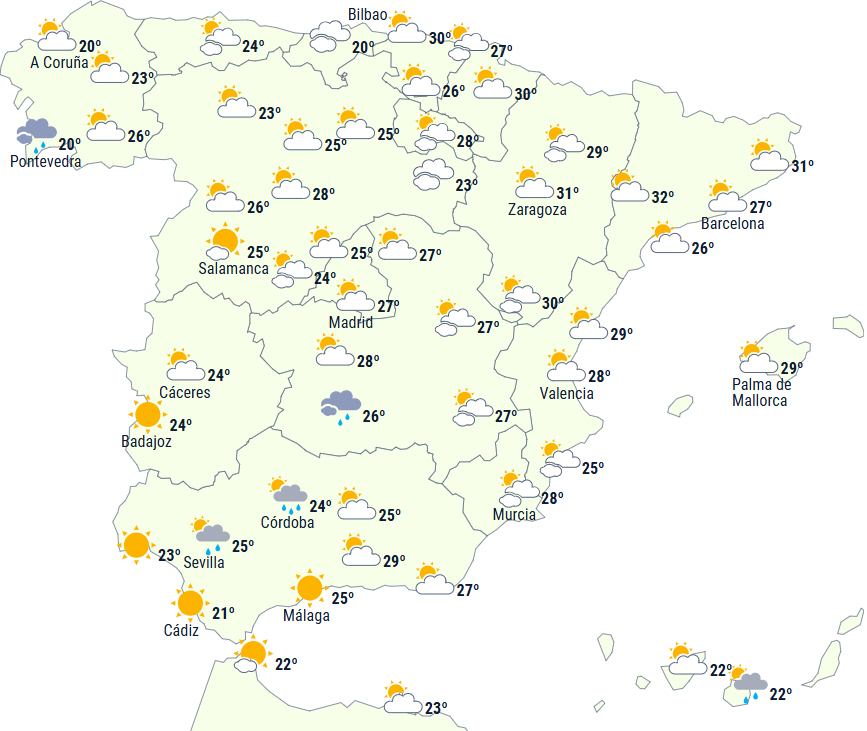Den ustabile vejrsituation vil fortsætte på Den Iberiske Halvø, der er under indflydelse af en dana, som er i færd med at udvikle sig til et lavtryk i nordvest. Der vil overvejende være letskyet med høje skyformationer, men om eftermiddagen kommer der flere skyer over den nordlige halvdel, mens det i sydvest gradvist klarer op.