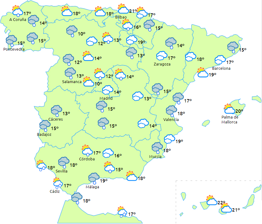 Skyet eller overskyet vejr med nedbør, der er mest sandsynligt om morgenen i den vestlige halvdel og i resten i dagens anden halvdel. Det kan være ledsaget af barro, og lejlighedsvise tordenbyger er ikke udelukket. Calima i de tidlige morgentimer. Minimumstemperaturerne er uændrede, og maksimumstemperaturerne er faldende, så vi havner på 16 til 20 grader og ni til 13 i nat. Let vind fra skiftende retninger, med moderat vind fra nord på nordkysten i de tidlige morgentimer.