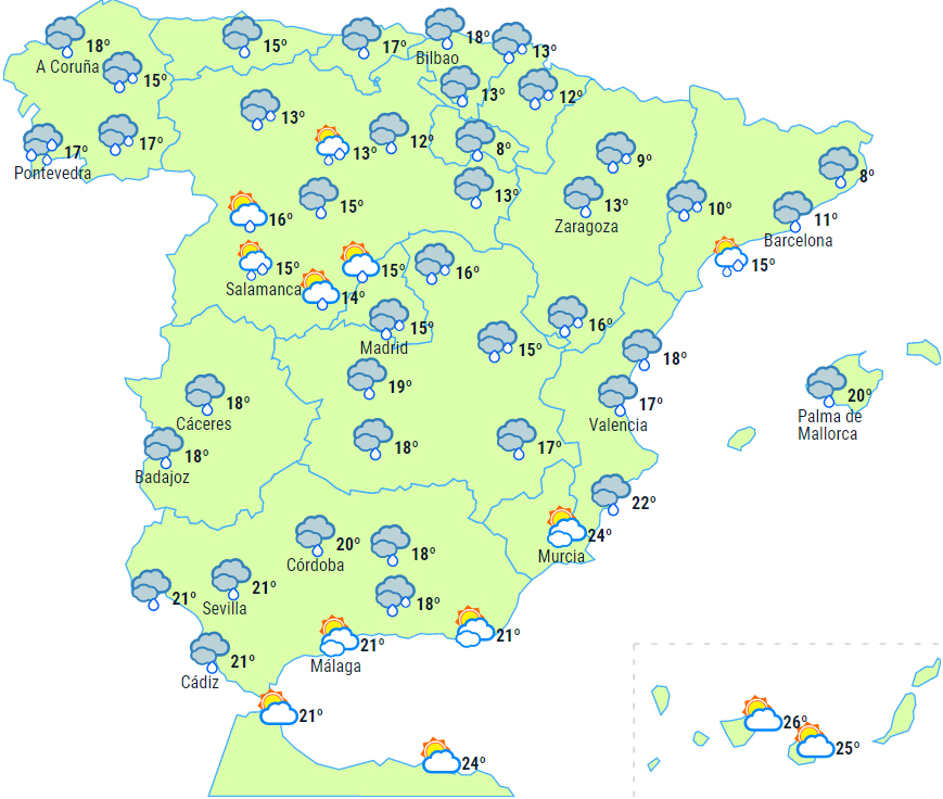 Skyet eller overskyet himmel over det meste af halvøen og Balearerne. Kraftig nedbør - undertiden med tordenvejr - til den nordvestlige del af halvøen og den sydlige Atlanterhavsside, som lokalt kan være kraftig eller vedvarende i Galicien, den nordlige del af Andalusien og den vestlige del af de centrale bjerge samt den sydlige højslette.