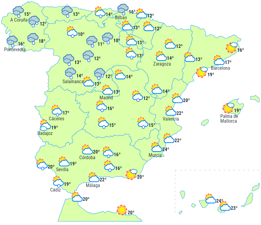 Generelt skyet himmel med nedbør i den helt nordlige og sydvestlige del af halvøen, som med nogen sandsynlighed kan brede sig til andre områder af halvøen, dog i en svagere form. Regn er mindre sandsynligt, jo længere mod øst vi kommer. På Balearerne skulle de således holde tørt, og det bliver letskyet.
