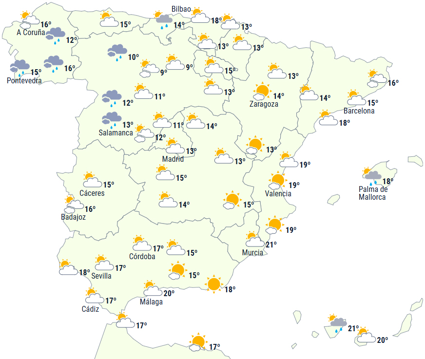 En koldfront fra vest bevæger sig østpå over den spanske halvø og forventes at nå Middelhavskysten og Balearerne senere på dagen. Her kan der lokalt opstå kraftig regn, der kan være ledsaget af torden og hagl.