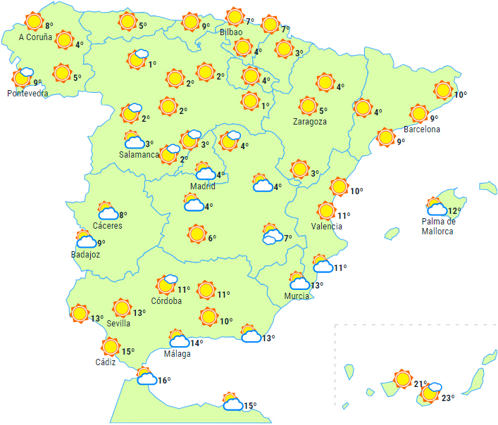 Dagstemperaturerne vil stige over næsten hele linjen, især i de nordøstlige bjerge, mens der dog ventes et fald på den yderste sydøstlige del. Nattemperaturerne vil stige i Gibraltarstrædet, mens der i resten vil være en tendens til et let til moderat fald, hvilket gør, at frosten fortsætter med at brede sig og dækker nu en stor del af halvøens indre egne undtagen den helt sydvestlige del og de kystnære områder. Lokalt tung frost i bjergene på den nordlige halvdel.