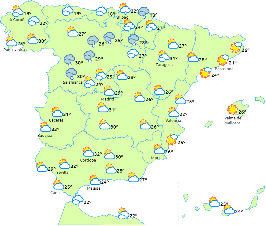 Klar himmel over det meste af halvøen afbrudt af perioder med højtliggende skyer. I den nordlige del af Galicien og ved nordvestkysten forventes der dog lavthængende skylag. Desuden vil der i en stor del af den nordlige halvdel af halvøen efterhånden blive mere overskyet, og det kan give regn- og tordenbyger i eftermiddag i området omkring den nordlige højslette. Lokalt kraftige byger i det nordlige Burgos, det indre Cantabrien, de nordlige dele af De Iberiske Randbjerge og det vestlige af Baskerlandet.