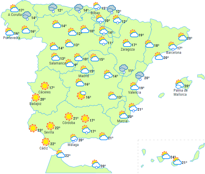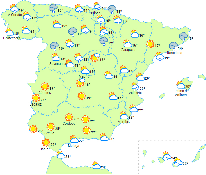 Varsler om vedvarende nedbør i den østlige ende af nordvestkysten og mulighed for lokalt kraftig nedbør i store dele af halvøens østlige egne samt på Balearerne.