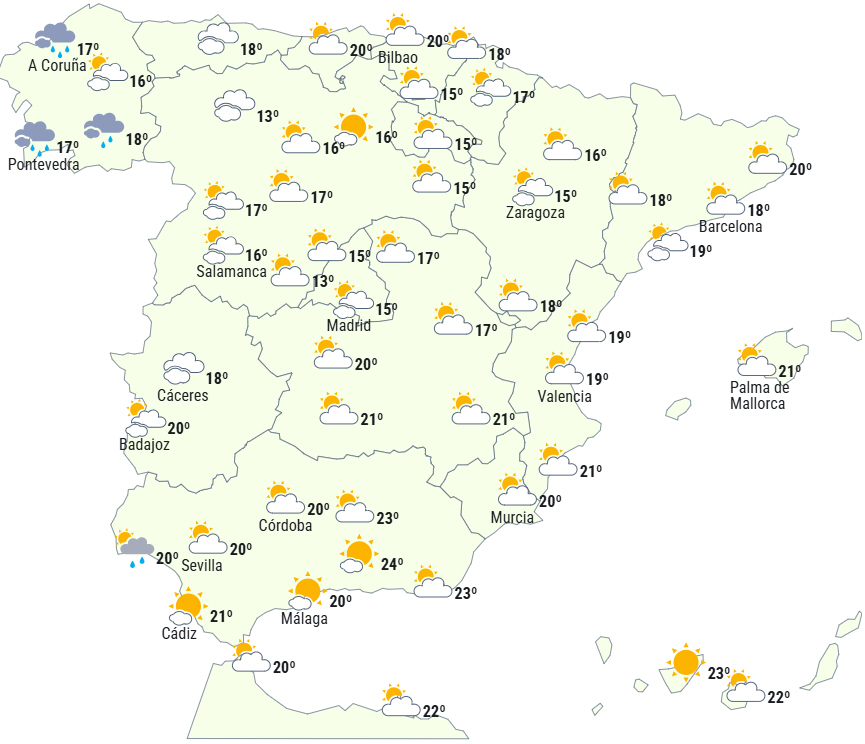 Dagstemperaturerne i let fald på den nordvestlige del af halvøen og stigninger på resten og De Baleariske Øer, lokalt bemærkelsesværdige stigninger i det centrale øst.